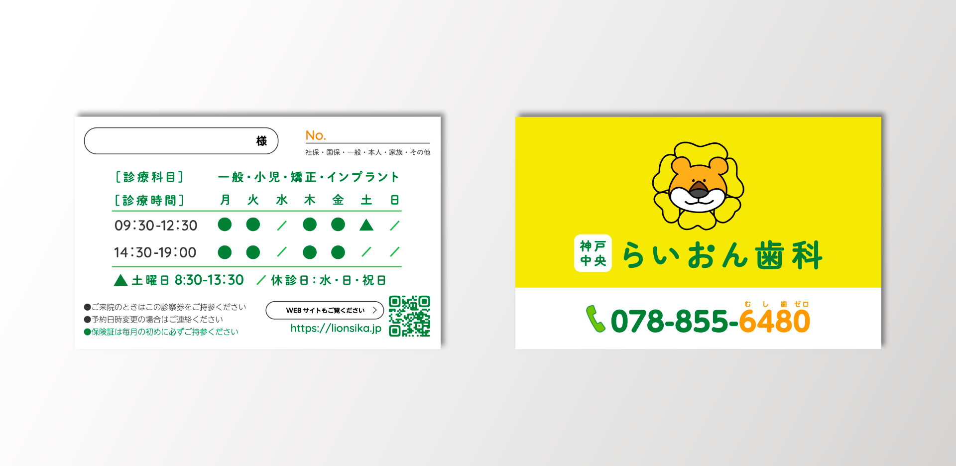 らいおん歯科様の診察券を、鮮やかな黄色を基調にデザインしました。