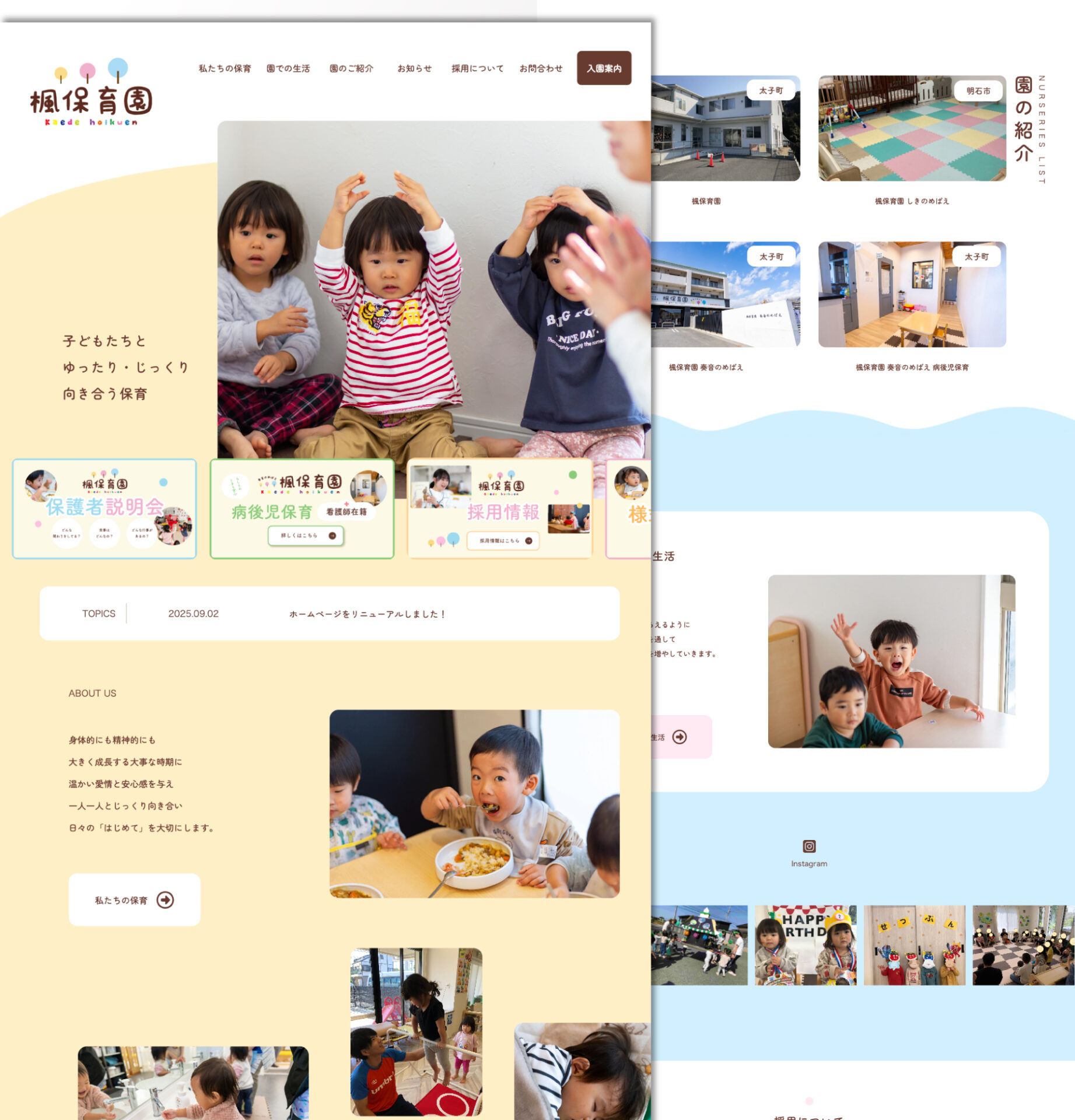 楓保育園様のロゴにある色をHP内にも使用し、「ゆったり」とした雰囲気になるよう円形や角丸を採用しています。
