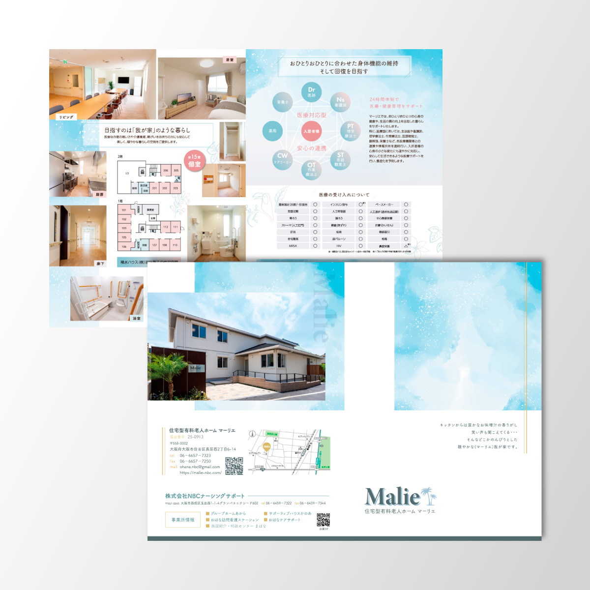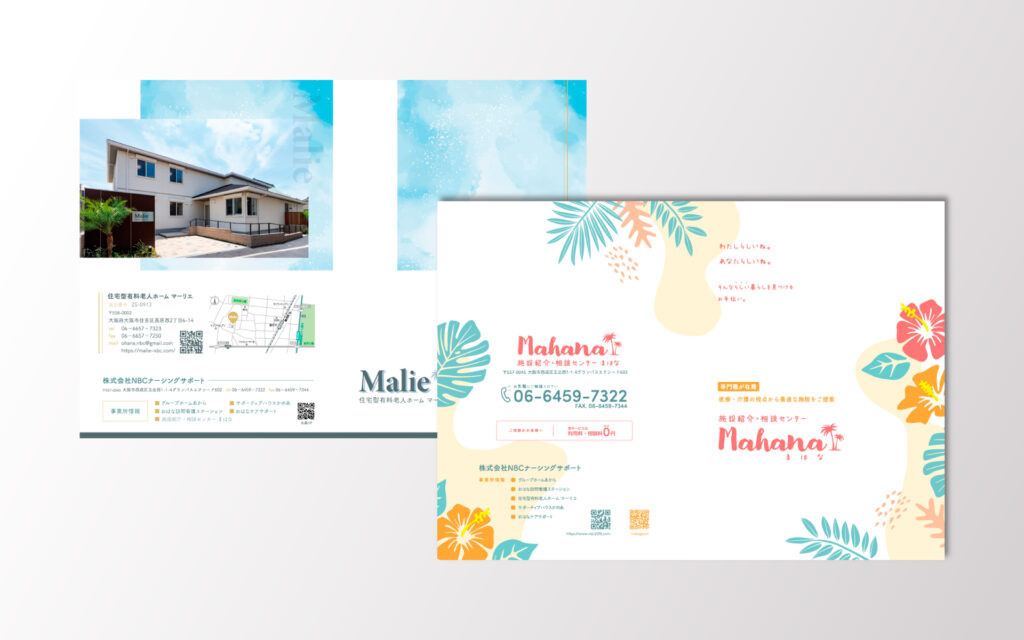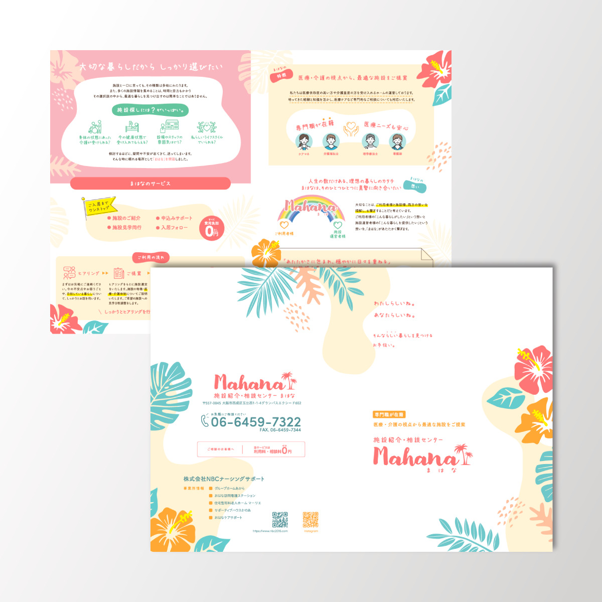 温かみとリラックス感のあるデザインに仕上げ、手書き風フォントや説明画像を取り入れることで、ご利用者様に寄り添う姿勢が伝わるチラシになっています。